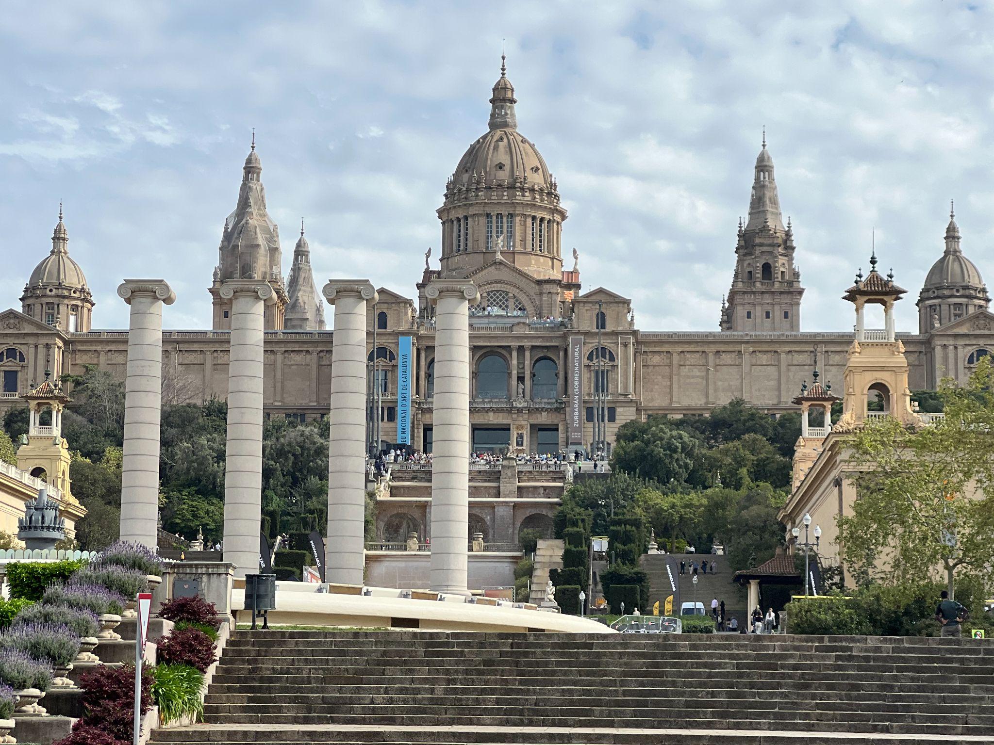 We started at the Palau Nacional, which houses the National Art Museum of Catalonia. One of the highlights of visiting this place is the Magic Fountain of Montjuic, a fountain, displaying vibrant colours and synchronizing with music. It is something you can’t miss. However, unfortunately for us, the fountain was closed, due to a drought and was under maintenance, so we couldn’t see the show.