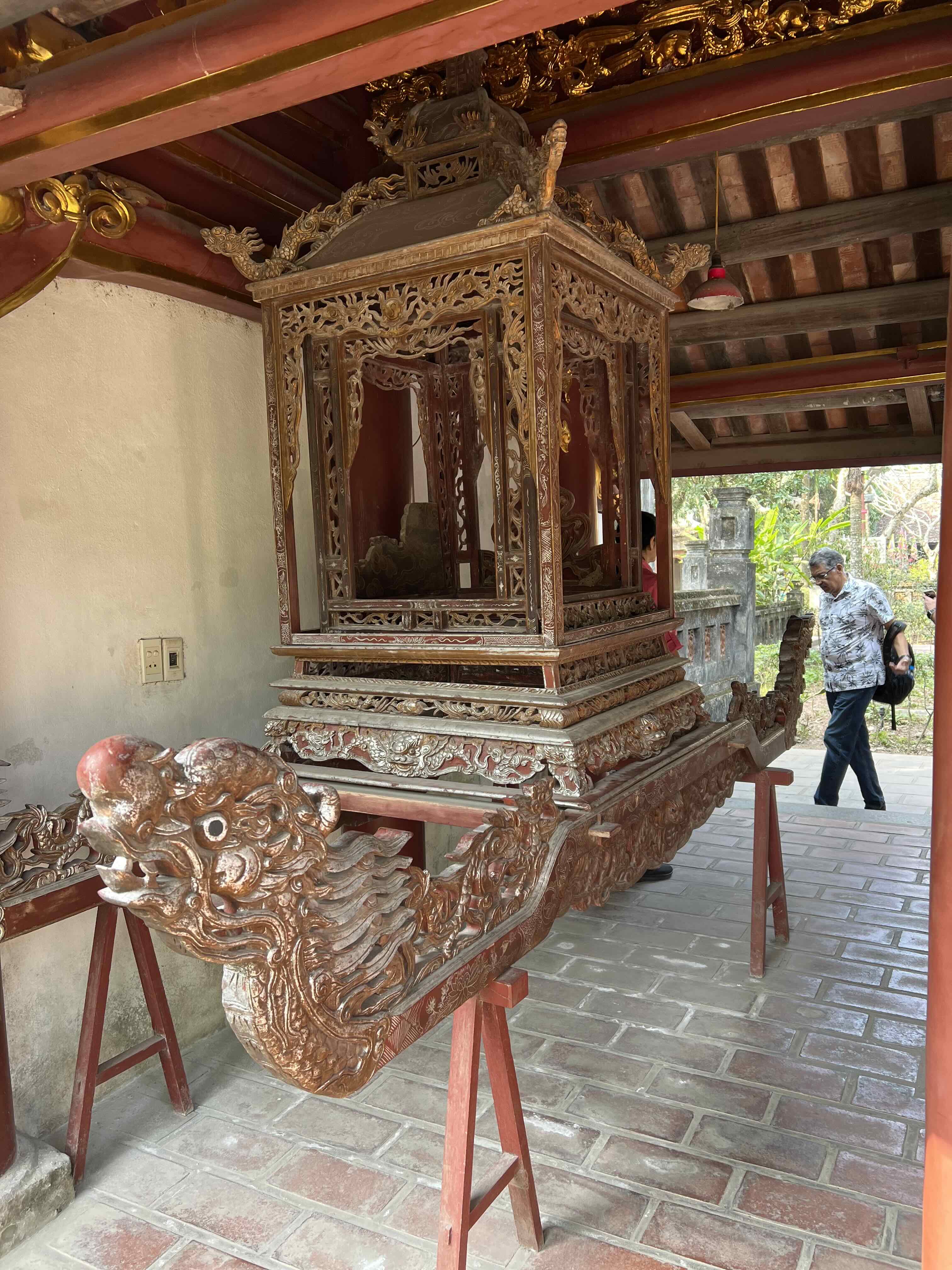 There were many temples in the complex and lots of offerings for the deities, like beer, oranges and incense. Outside, there were dragon beds, 2 ton stone beds with dragons carved all around. The king used to put a mattress on and sleep on the bed. Outside the temple, we saw a bronze palanquin that the king used to ride. We also saw a huge buffalo, all dressed up so others could ride it or take photos for a price.