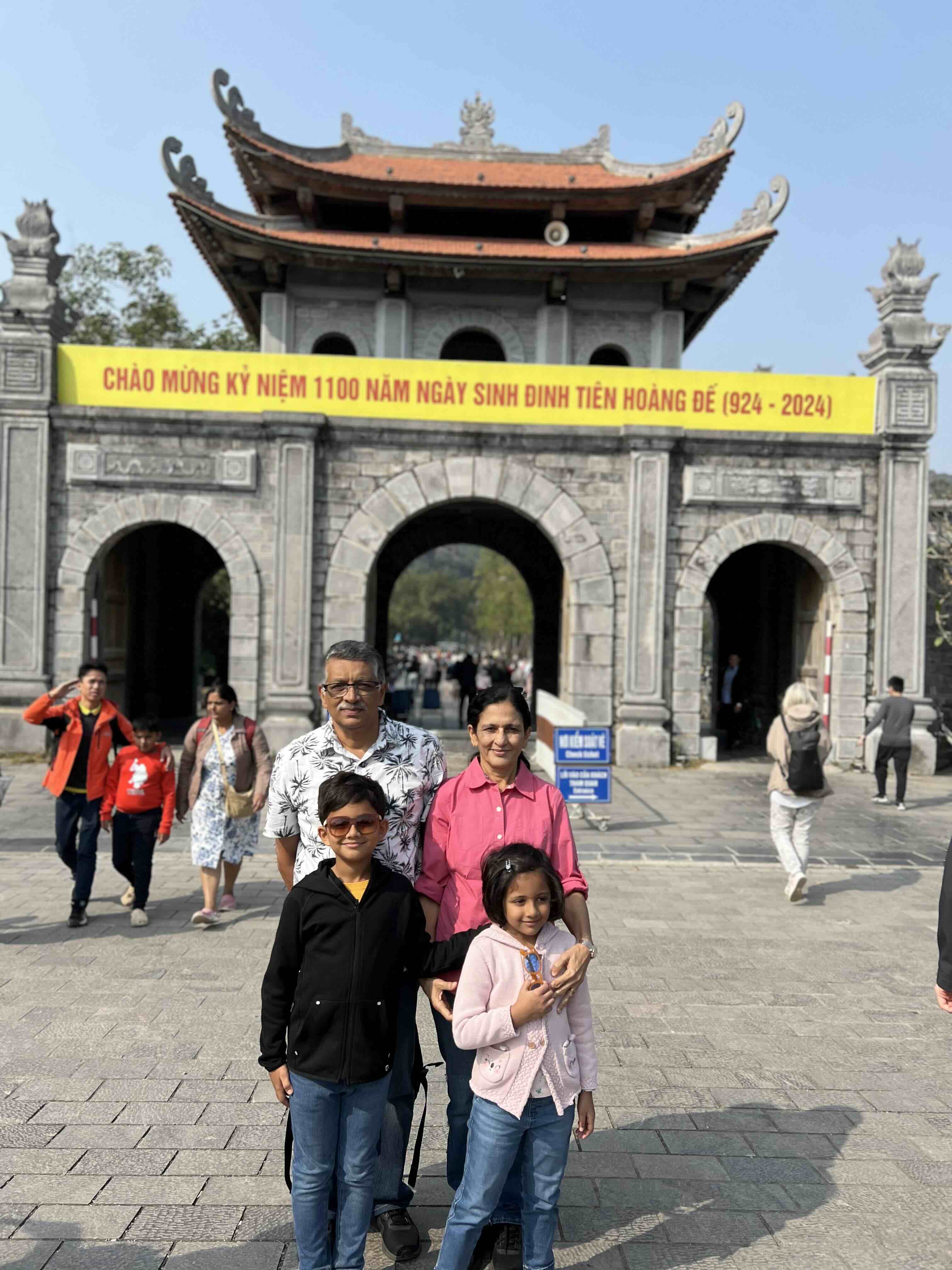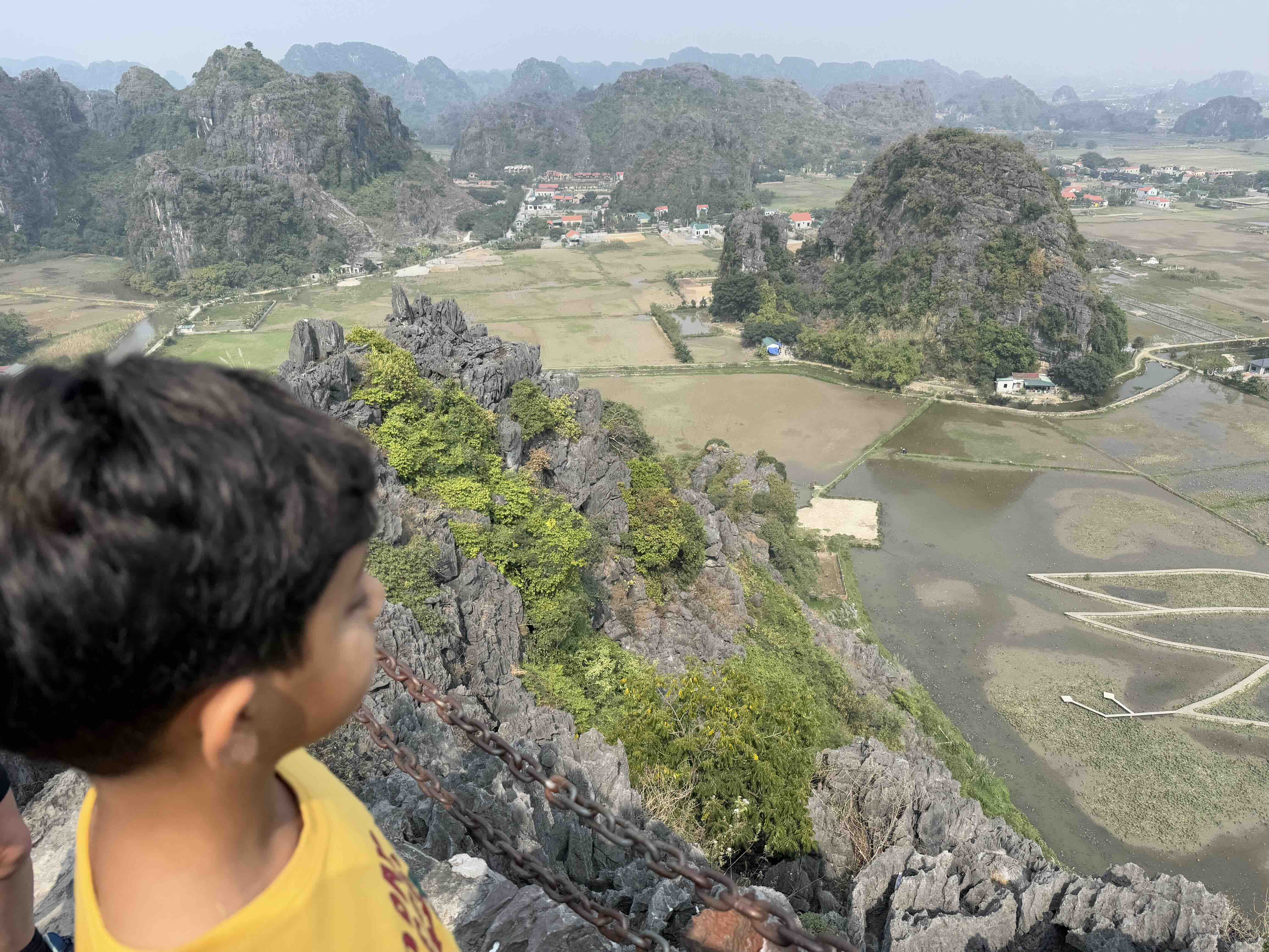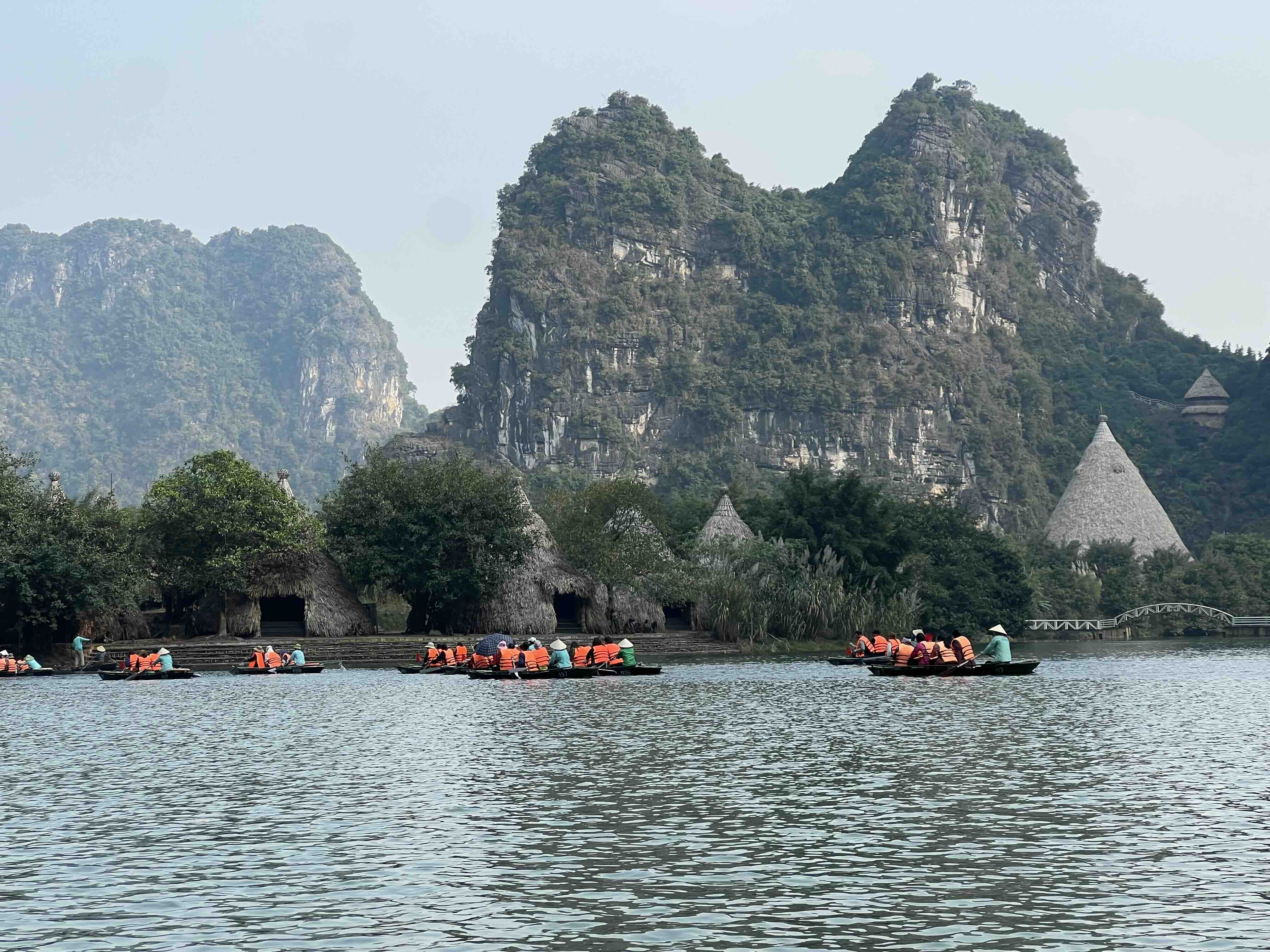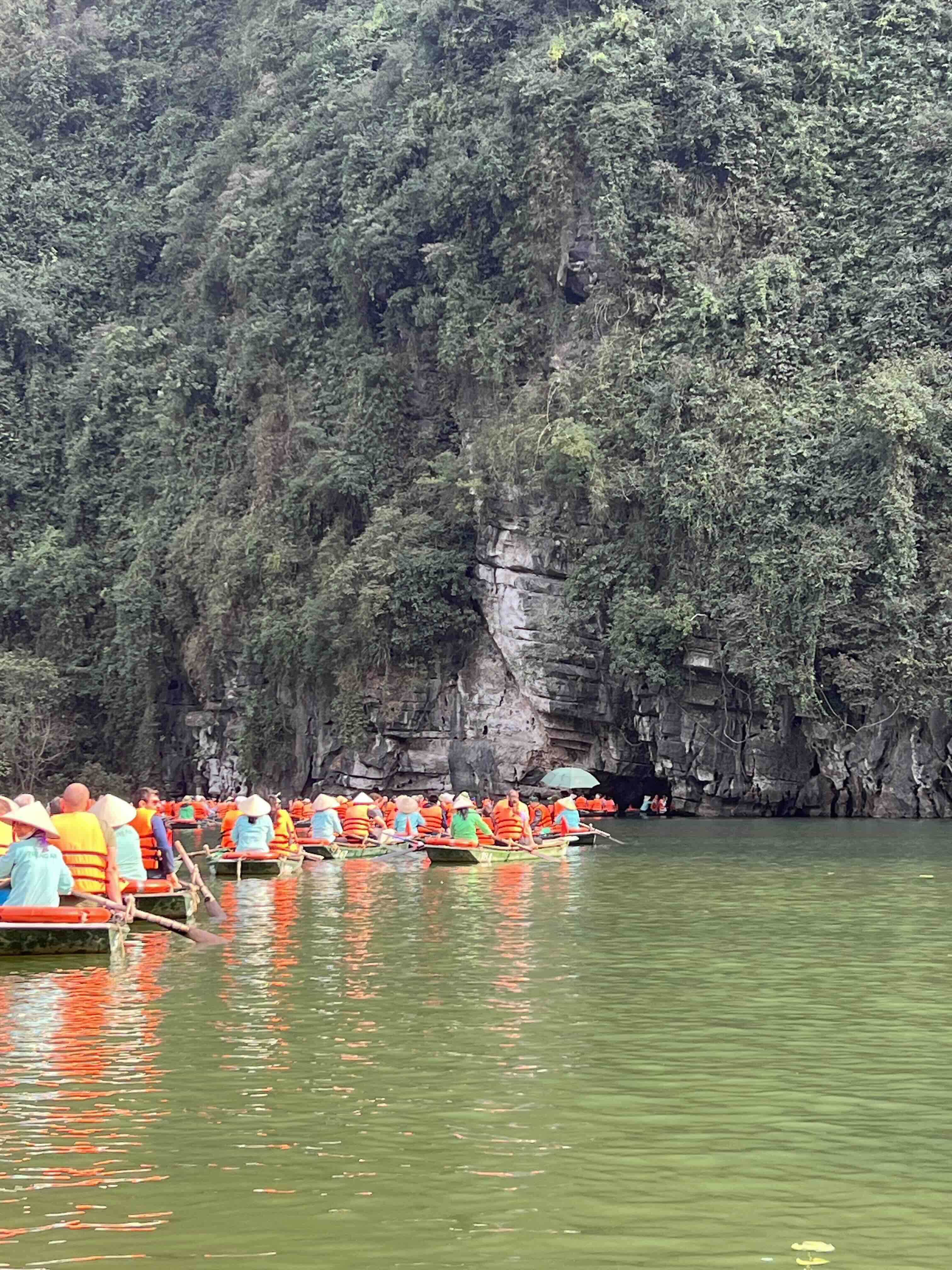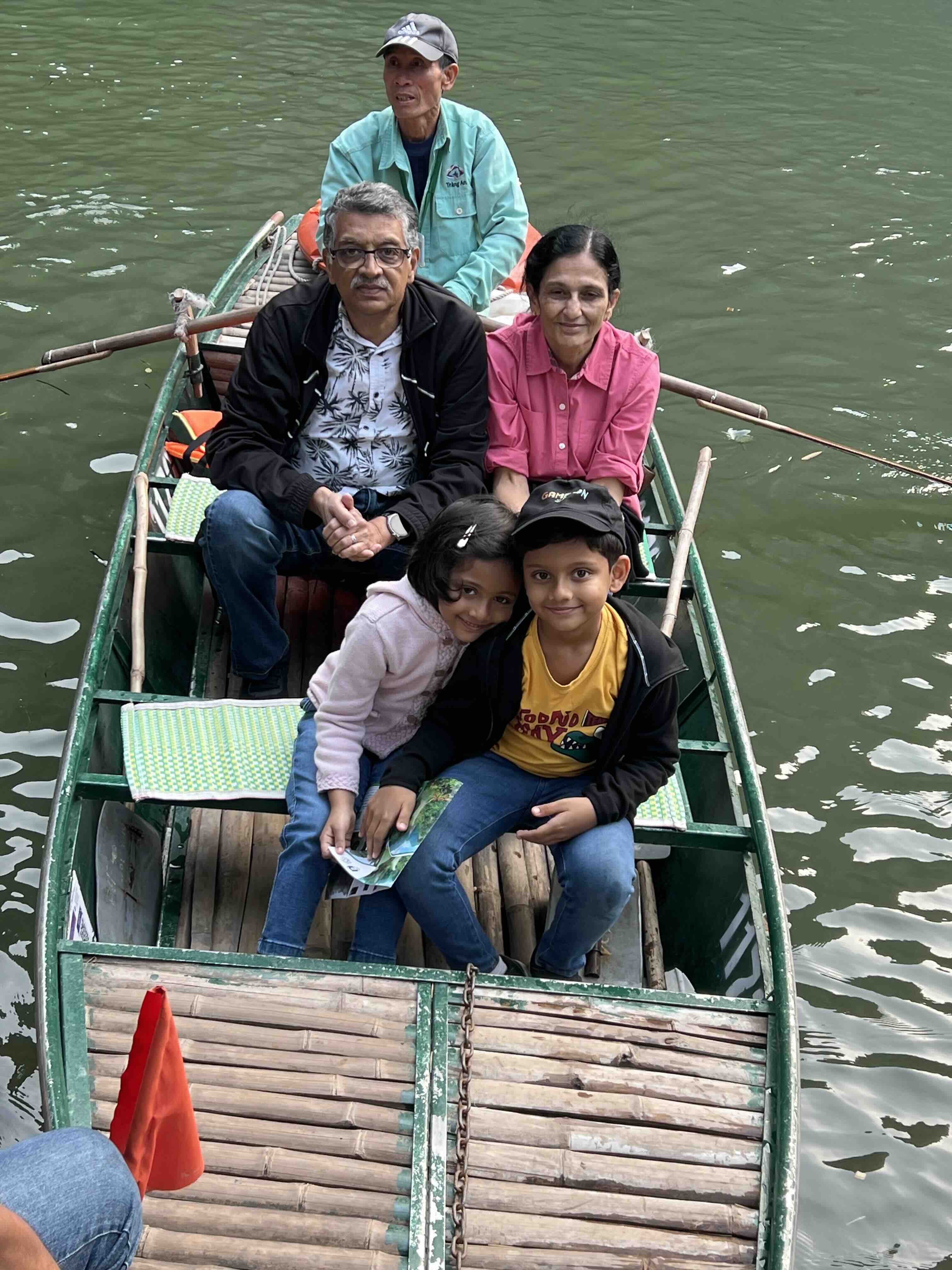 Towards the end of the day, we went to Trang An. It is a complex of limestone mountains. A river cuts through this and you can row boats through the caves in the limestone mountains. There are three routes you can take but we took the second one, with a total of four caves. The boat can only fit four people and a driver who rows the boat with long bamboo oars. We had to split into two boats, my parents in one and us with our grandparents.