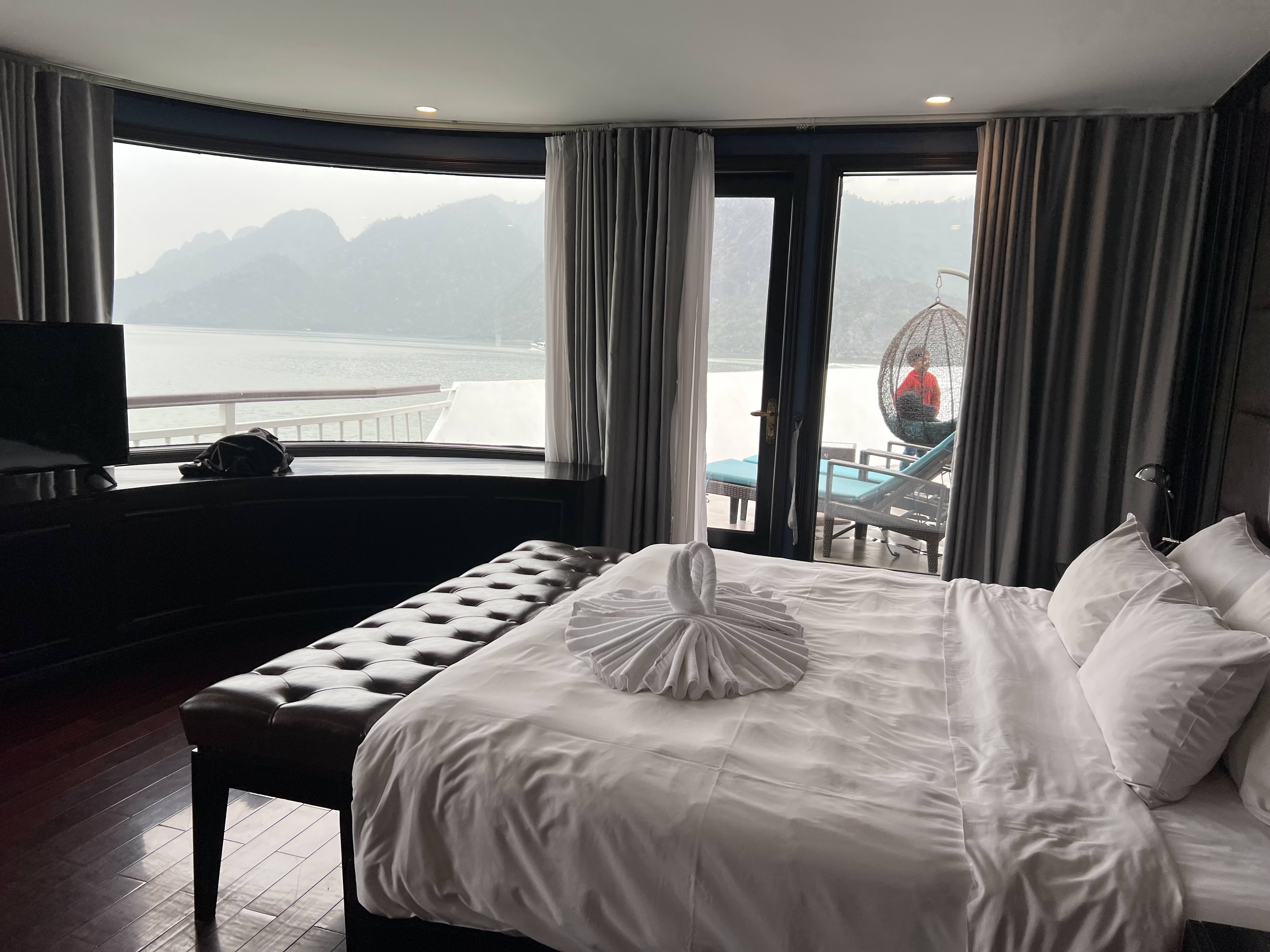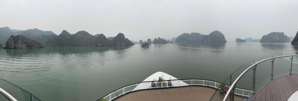 At the port, we took a mini boat to the Dora Cruise, our home for a night. While on the mini boat, our guide gave us a briefing and told us more about Halong bay. Like Ninh Binh, Halong bay is full of limestone rock formations except that they’re all in the sea. our captain said there were around 200 of them in Halong Bay. I also saw lots of people collecting barnacles on the shores nearby as it was low tide.