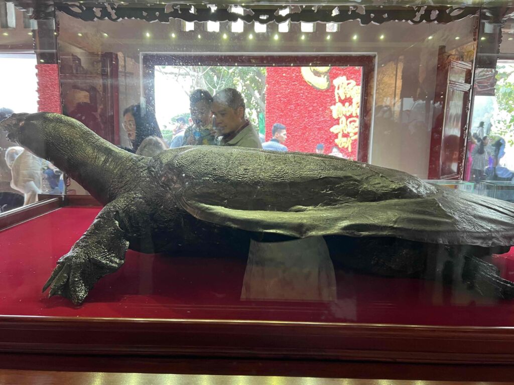 Per the myth, the king of Vietnam was at war with his enemies, and one day when he was on the lake, a turtle rose from the water and gave him a sword which he used to defeat his enemies and bring peace to the country. After that he returned the sword to the turtle and named the lake Hoan Kiem Lake. In the temple, there were two preserved bodies of the species of turtle that was in the myth. Only six of this species remain in the world today. The turtles were huge, almost as big as I was!