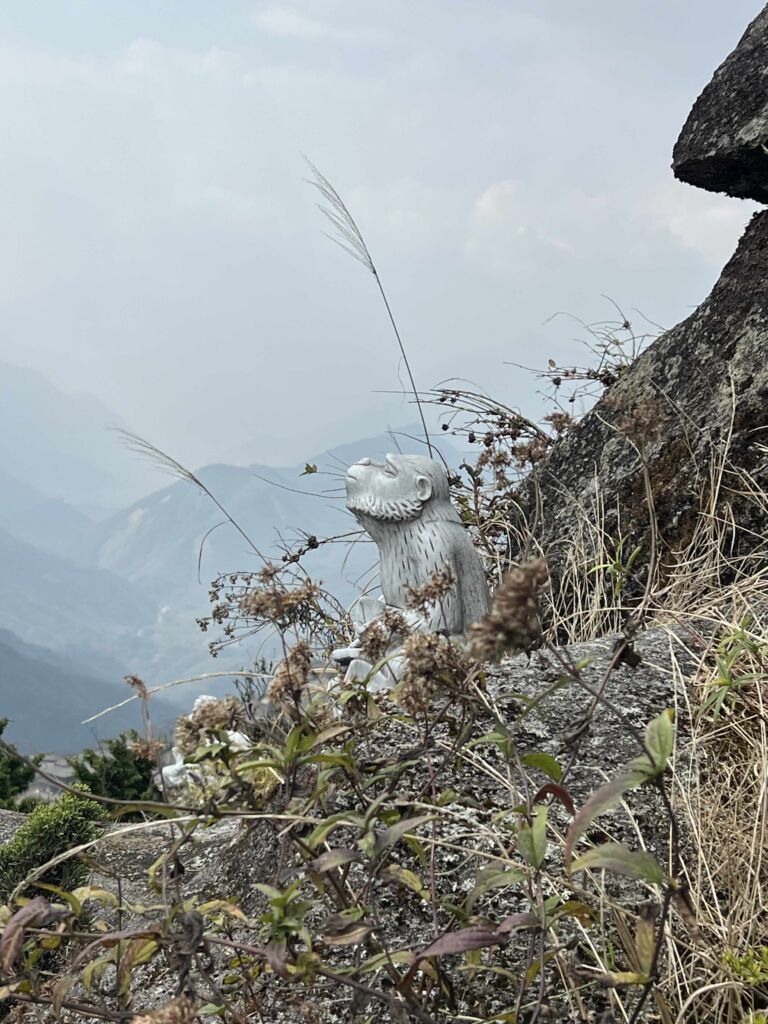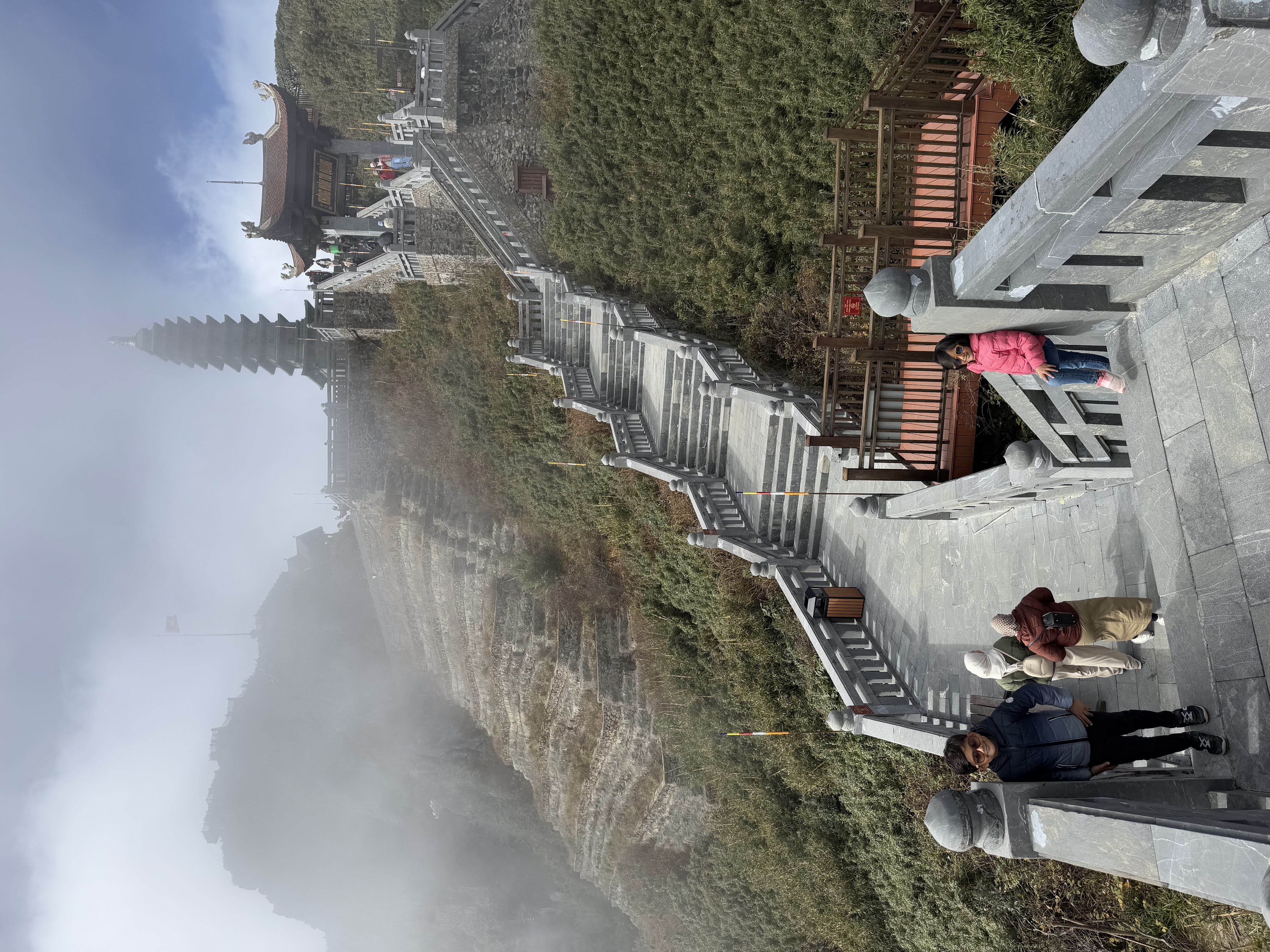 For the second segment, we took the cable car to around 3000 meters from the top. Soon, we were in the clouds! I couldn’t see anything as the whole area was just white. It looked like the cable was going to end! At the top of the cab car ride, there were a couple of temples dedicated to the Buddha. The final segment of the trip is either a 600 step climb to the summit or another funicular train ride.