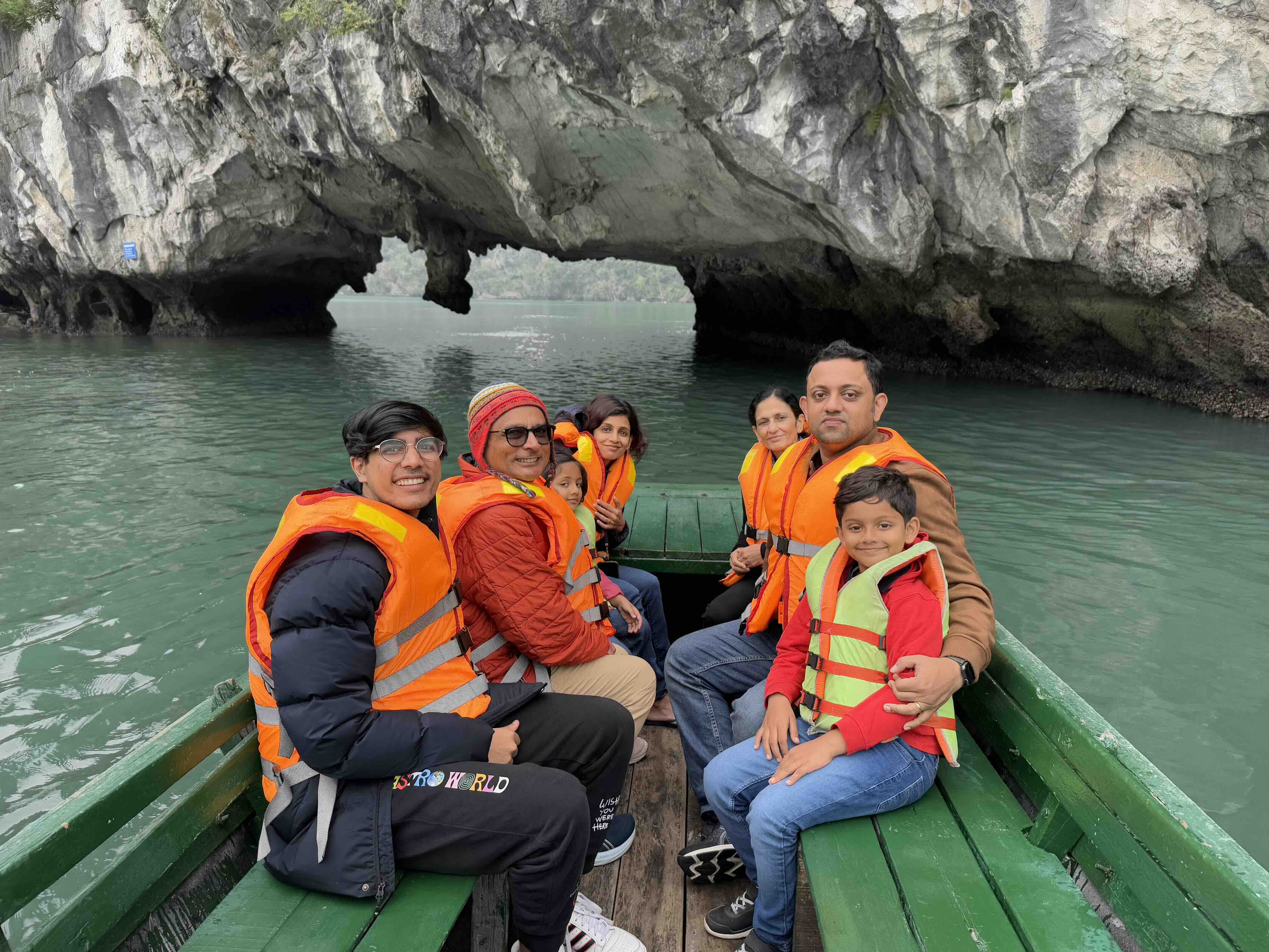The next morning after breakfast we took the mini boat to the Dark and Light caves. We went on a boat with Dev and his father. We couldn't go to the Dark cave because it was too dark. We only went through one short cave (Light cave) that was passing through a rock formation. My dad was the biggest that almost everybody had to sit on the other side to balance the weight of the boat!