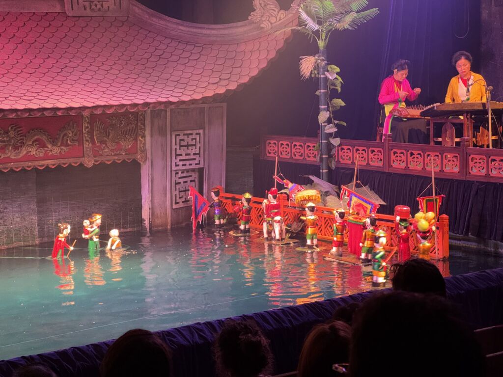 Next, we went to a water puppet show at the Thang Long Water Puppet theatre. This is a traditional Vietnamese puppet show, formerly performed by farmers during the flood season. They are called water puppets because the puppets are maneuvered over the water. We got audio guides to help us understand the story as it was all in Vietnamese. The stories were really interesting; my favorite one was about a fox trying to eat ducks. Each day, it would sneakily try to evade the owner and catch one of his ducks. In another scene with dragons swimming in the water, fire actually came out of their mouths!