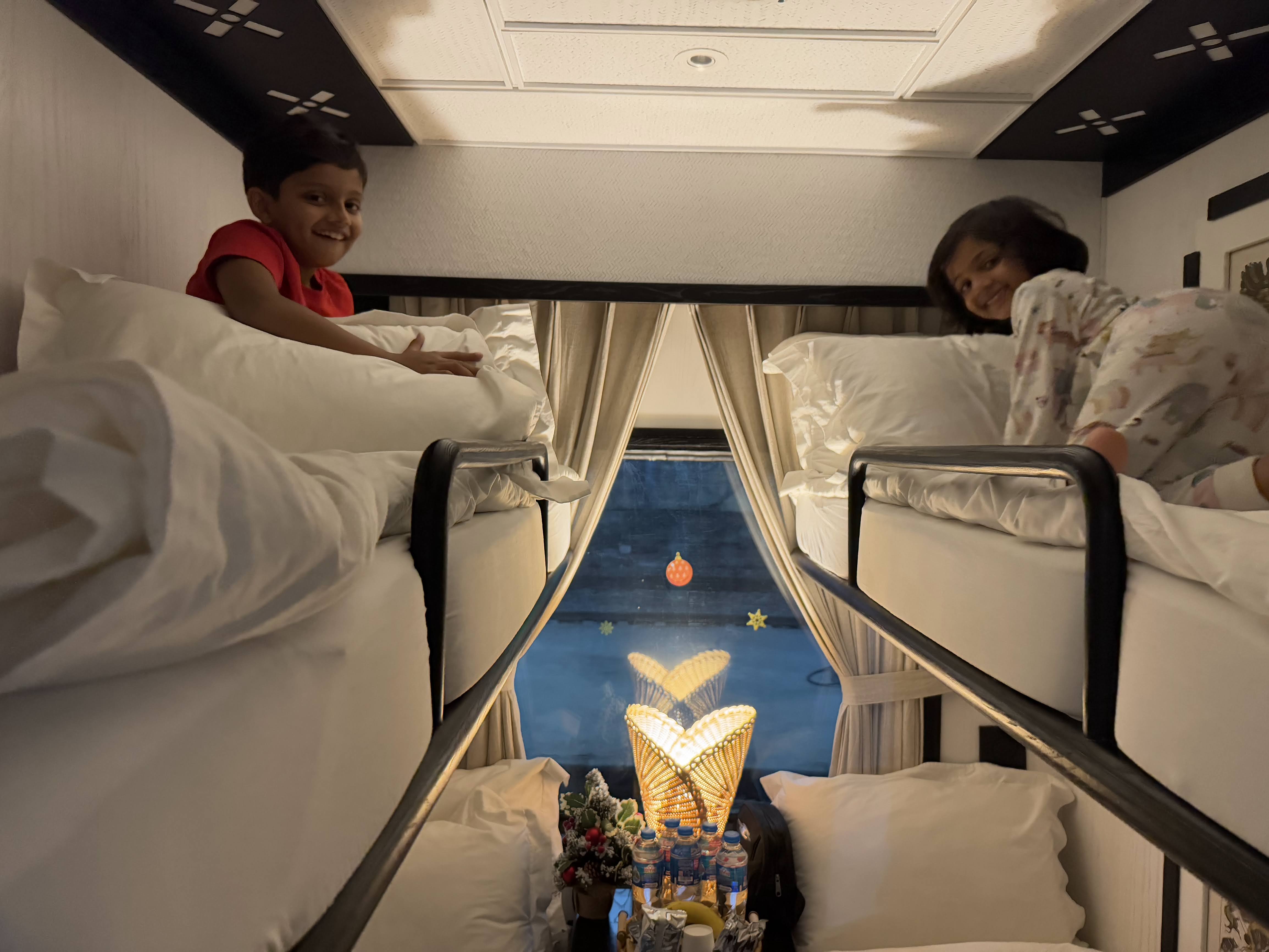 You can travel to Sapa from Hanoi by train or by car. We took a sleeper train to Sapa. The sleeper train is an overnight train, sort of like a moving hotel. The rooms were all on one side and each room had two bunk beds. In my grandparents room, the top bunks were raised so that there were only two beds.