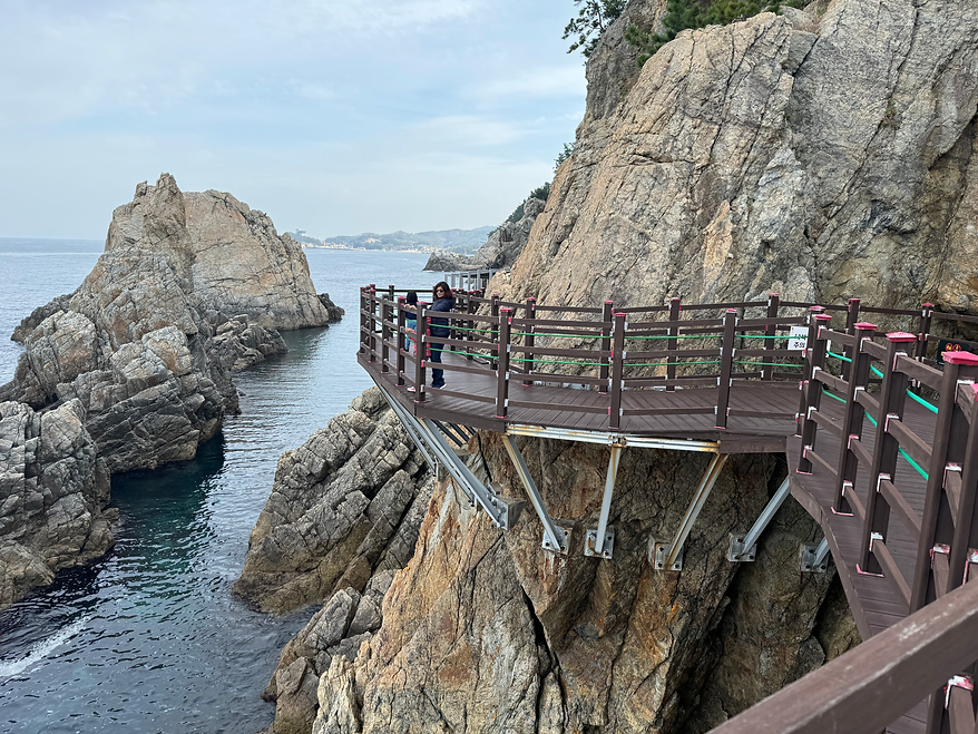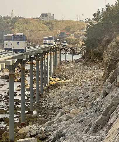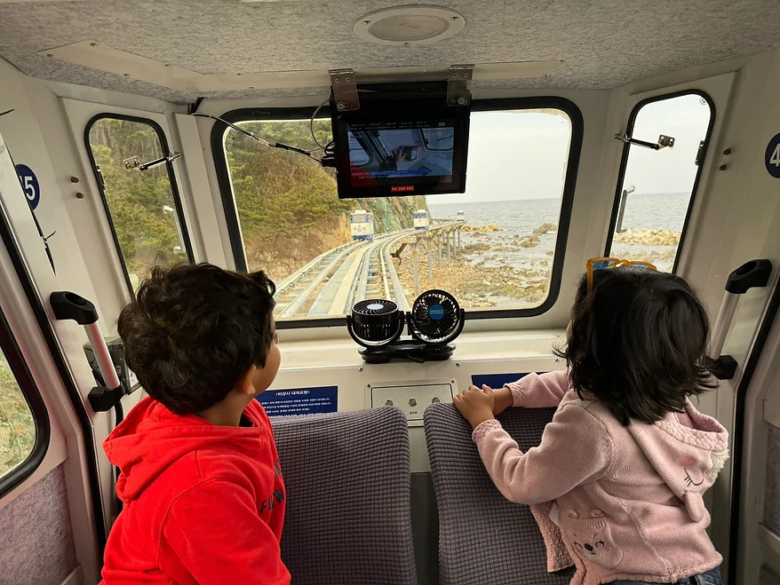 The next stop was at a Sky train at Jukbyeon along the east coast. The Skytrain was a small capsule that runs on the edge of the cliff so you can see the seaside. We could also see huge rocks and seagulls bobbing back and forth in the water. At the end of the track, we had to reverse and switch tracks to go back to the start.