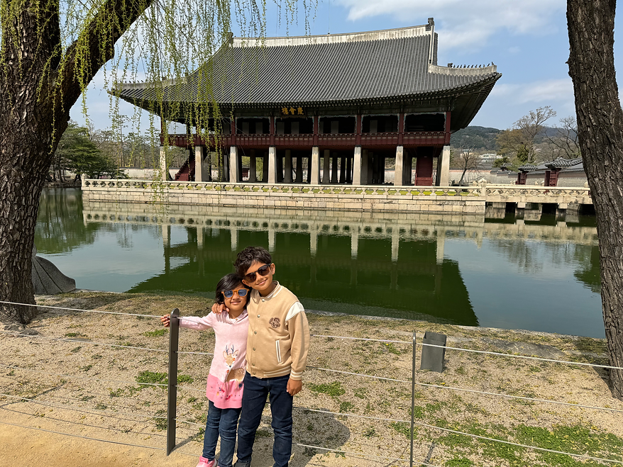 The next day we drove to Seoul, the capital of Korea, the fourth biggest city in the world. After reaching Seoul, we went first to the Gyeonbokung palace, where king Sejong of the Joseon dynasty used to live. There were Ondols in each room, an invention room, a banquet hall surrounded by a lake (it was beautiful), a room for talking to his officials, a room for his kids, a room for his grandmother and a HUGE kitchen. The king must have loved to eat!