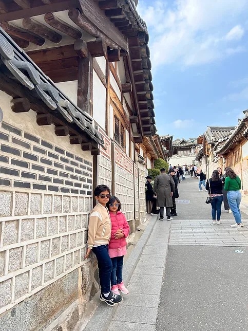 After that, we walked to Bukchon Hanok village. There was a very famous street with lots of Hanoks side by side. We could see Seoul tower in the distance.