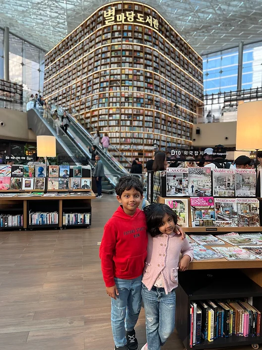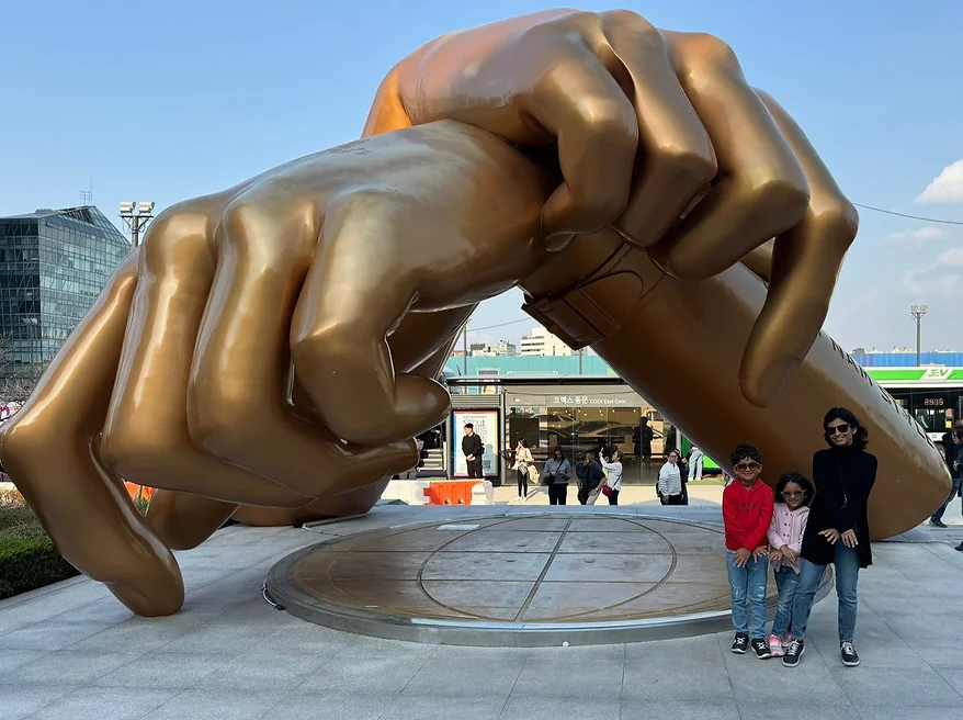 After the museum, we went to Star field mall, one of the largest malls in Asia, which was located at Gangnam. We could see a big statue of the hand sign in the famous Korean song called ‘Gangnam Style’. Inside the mall, there was a library with bookshelves going to the ceiling! My parents did a bit of shopping and I entertained Rebekah by playing a game with her.